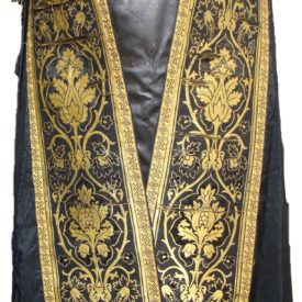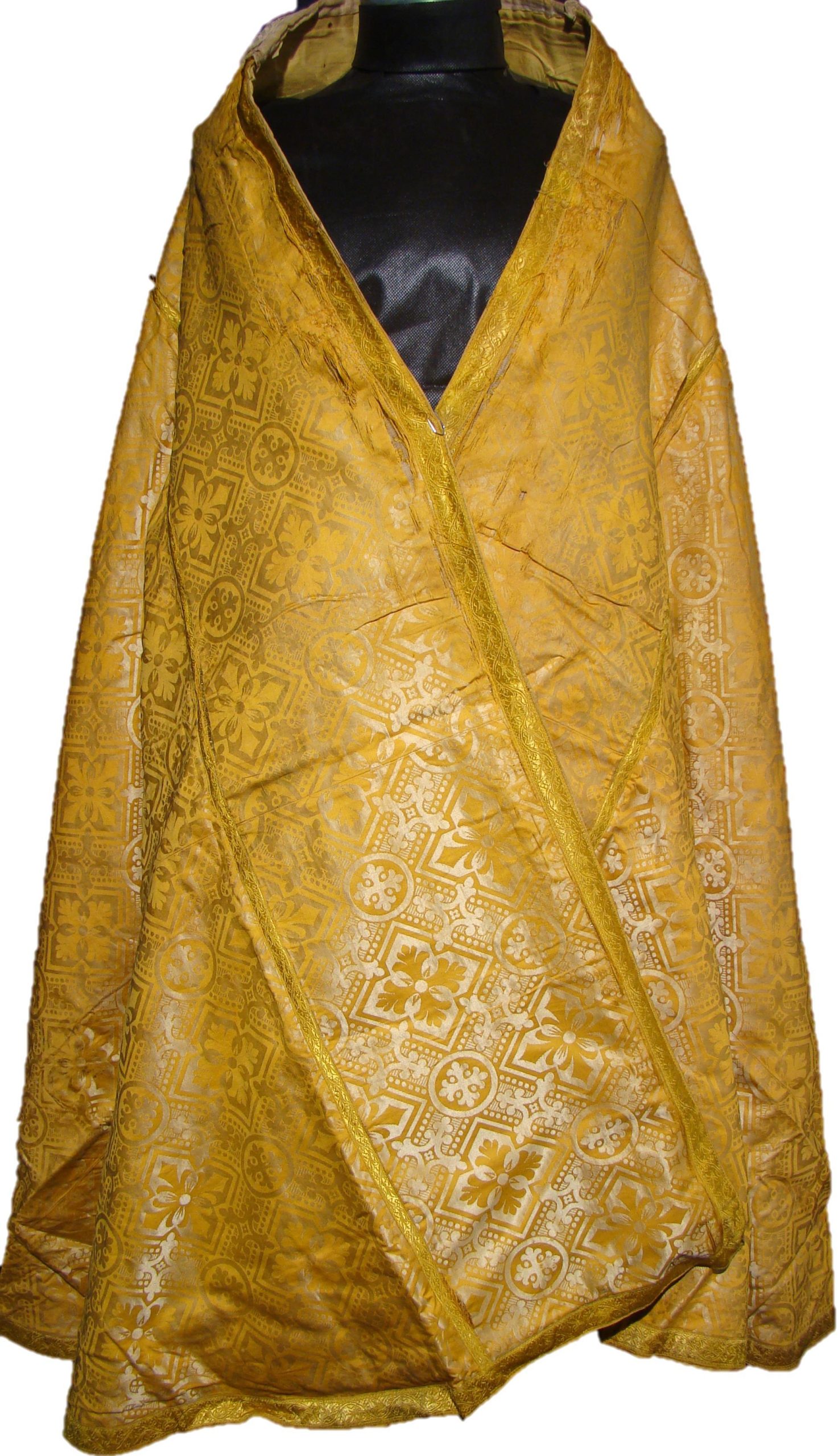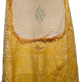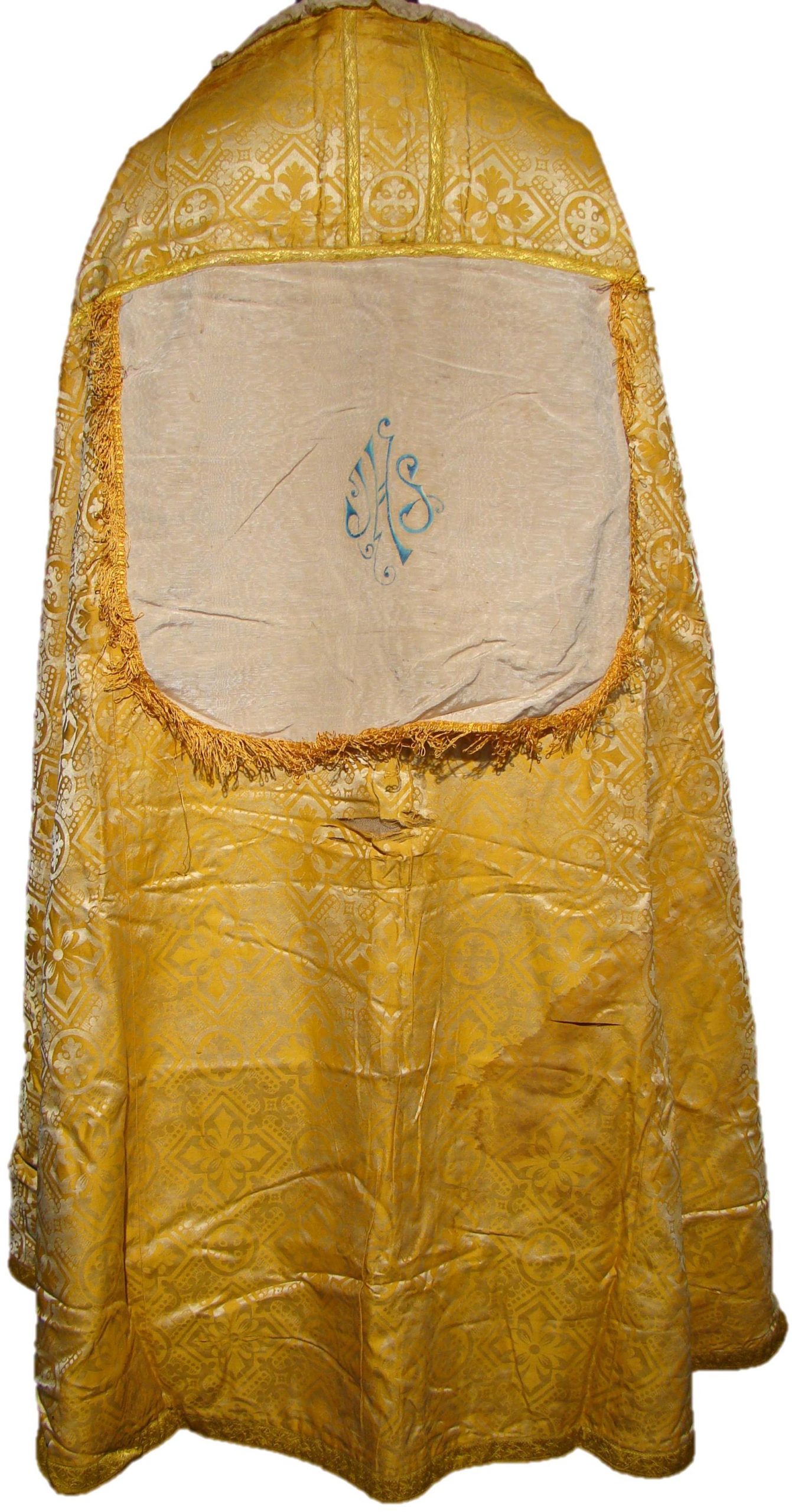 Peça costurada à máquina, com o arremate de passamanaria fixado à mão. A capa em tecido adamascado dourado, é arrematada com galões dourados e nos detalhes do adamascado é possível identificar vários formatos de cruz. Na gola ela possui uma pequena renda branca, na parte posterior existe um apêndice na cor branca com uma pintura feita à mão com a inscrição JHS (Iesus Hominun Salvator), que em uma forma estilizada forma uma folha.