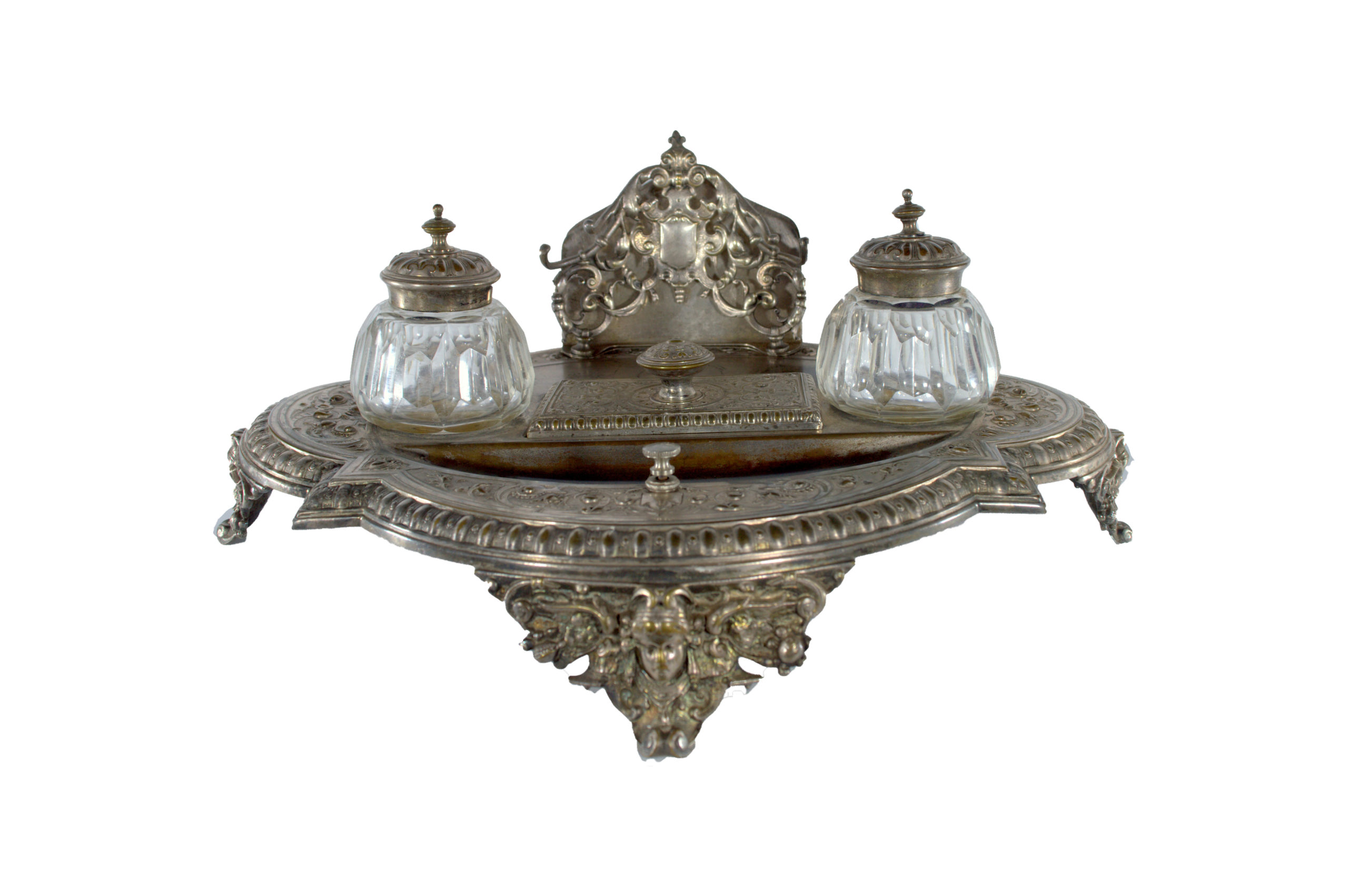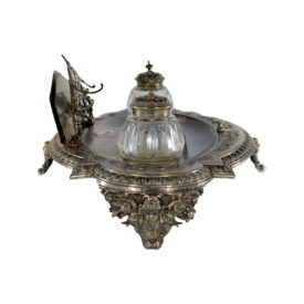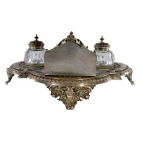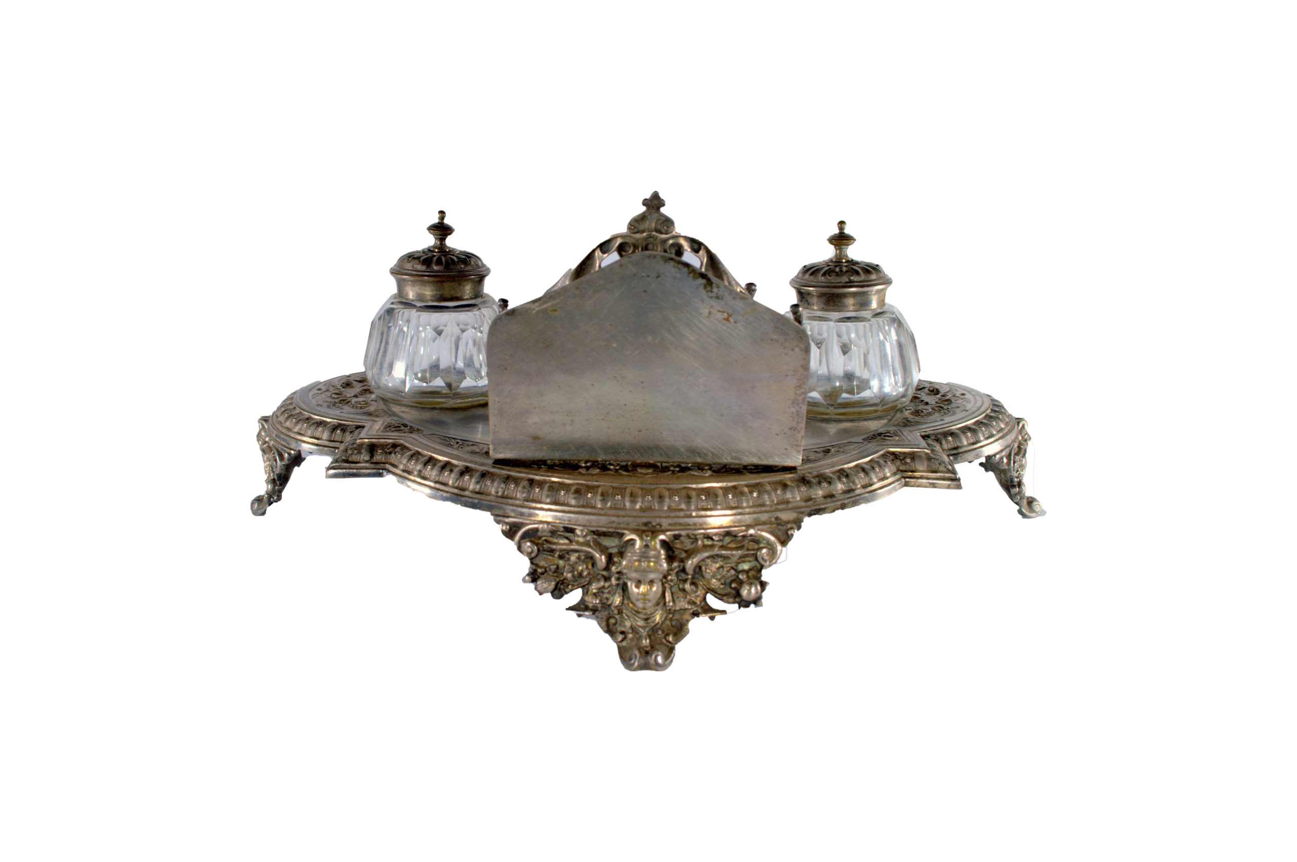 Peça de metal fundido cinzelado prateado de forma oval, com quatro pés, que tem a forma de cartela, com voluta, roseta e uma figura humana ao centro adornada por um capacete. A bandeja que serve de suporte é composta por dois recipientes de tinta de cristal com tampa de prata, ao centro um mata-borrão e um suporte para papéis. Toda a extensão é adornada com detalhes de volutas, fitomorfos e perolados, estrias, o suporte é adornado por uma cartela com volutas, em uma das extremidades da base existe um pequeno detalhe circular que aciona uma sineta localizada na parte de baixo; na outra extremidade existe um orifício com uma marca circular ao seu redor. A peça é compota por 8 peças, que forma uma única peça.