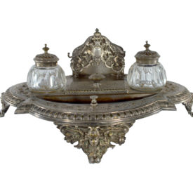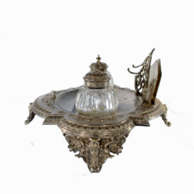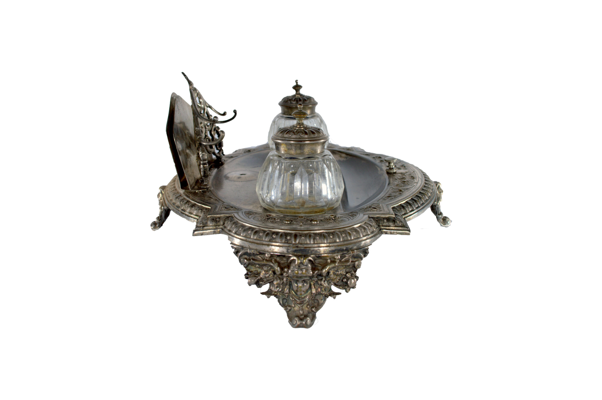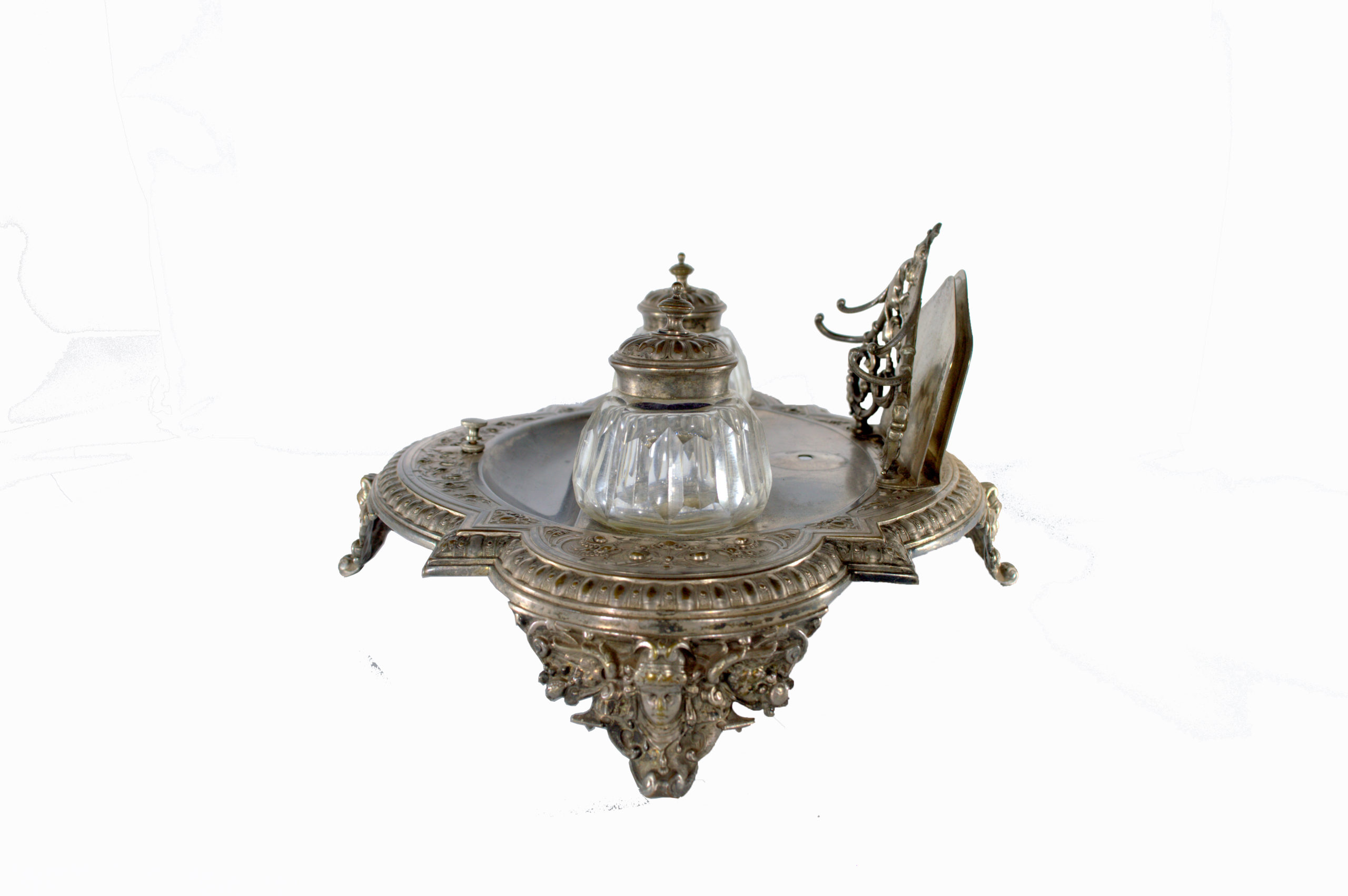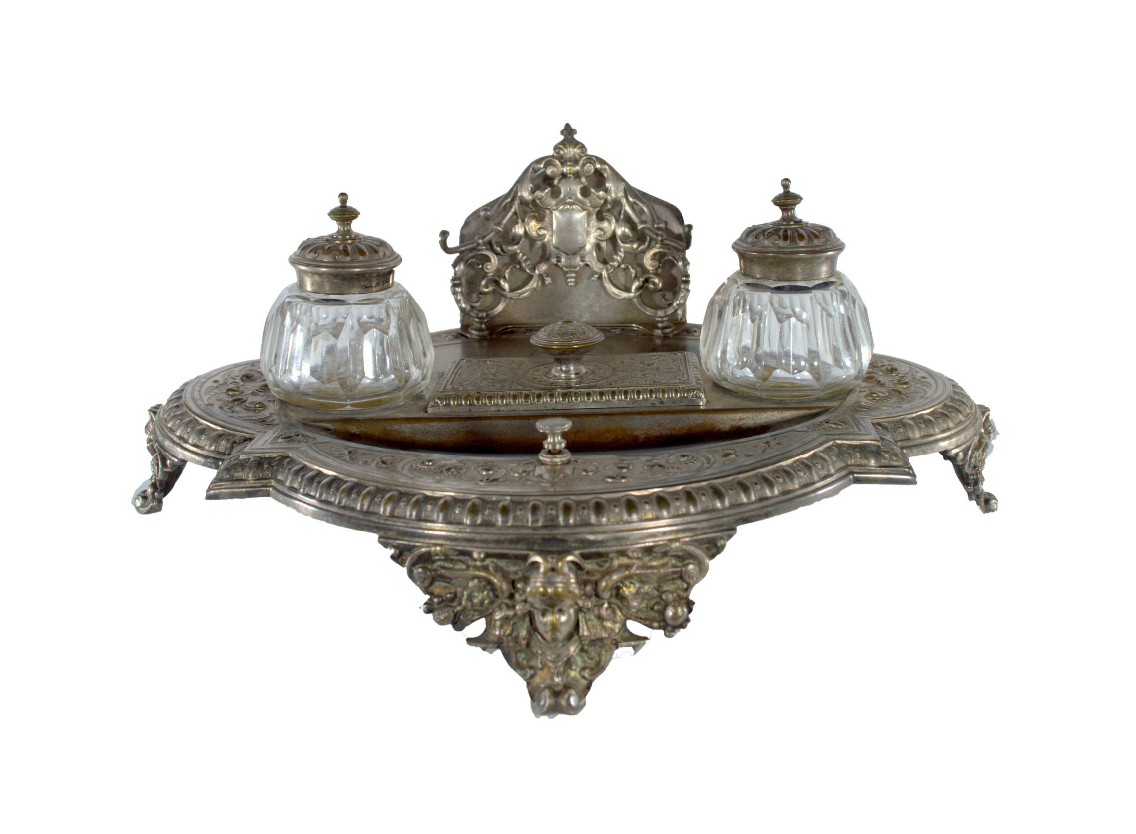 Peça de metal fundido cinzelado prateado de forma oval, com quatro pés, que tem a forma de cartela, com voluta, roseta e uma figura humana ao centro adornada por um capacete. A bandeja que serve de suporte é composta por dois recipientes de tinta de cristal com tampa de prata, ao centro um mata-borrão e um suporte para papéis. Toda a extensão é adornada com detalhes de volutas, fitomorfos e perolados, estrias, o suporte é adornado por uma cartela com volutas, em uma das extremidades da base existe um pequeno detalhe circular que aciona uma sineta localizada na parte de baixo; na outra extremidade existe um orifício com uma marca circular ao seu redor. A peça é compota por 8 peças, que forma uma única peça.