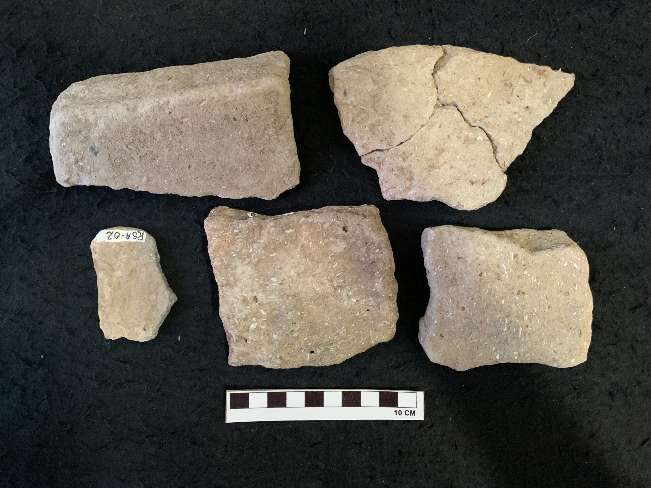 A cerâmica é o material confeccionado e moldado pela mão humana a base de variados tipos de terra, com diversas finalidades de uso, como no armazenamento de água, alimentos, restos mortais e entre outros. Disponível 5 fragmentos de peças de bases. A base está localizada na parte inferior da cerâmica.