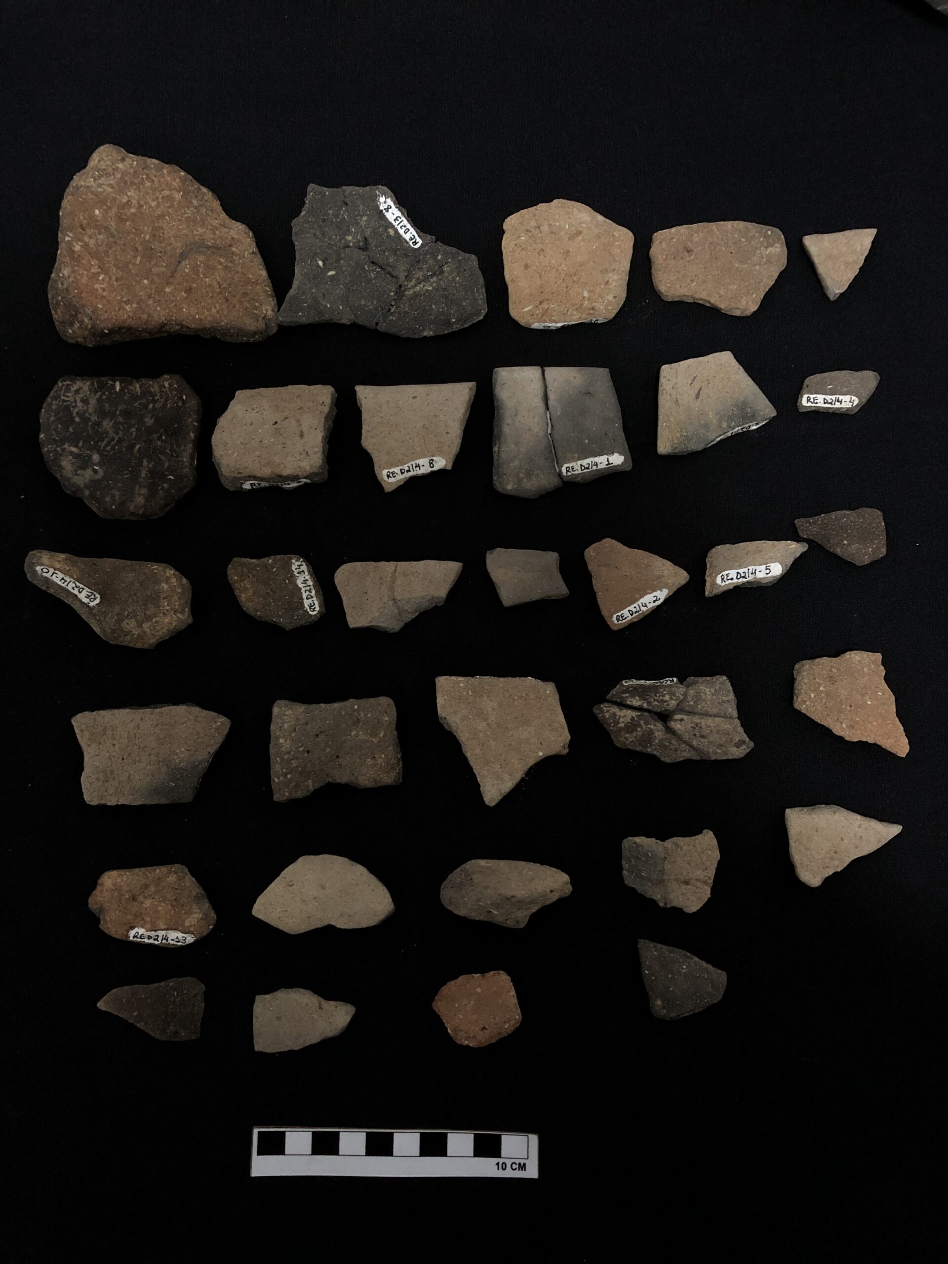 A cerâmica é o material confeccionado e moldado pela mão humana a base de variados tipos de terra, com diversas finalidades de uso, como no armazenamento de água, alimentos, restos mortais e entre outros. Disponível 32 fragmentos de peças de cerâmicas (Bojos, parte central e principal do corpo da cerâmica, e Bordas, parte superior da cerâmica.