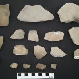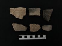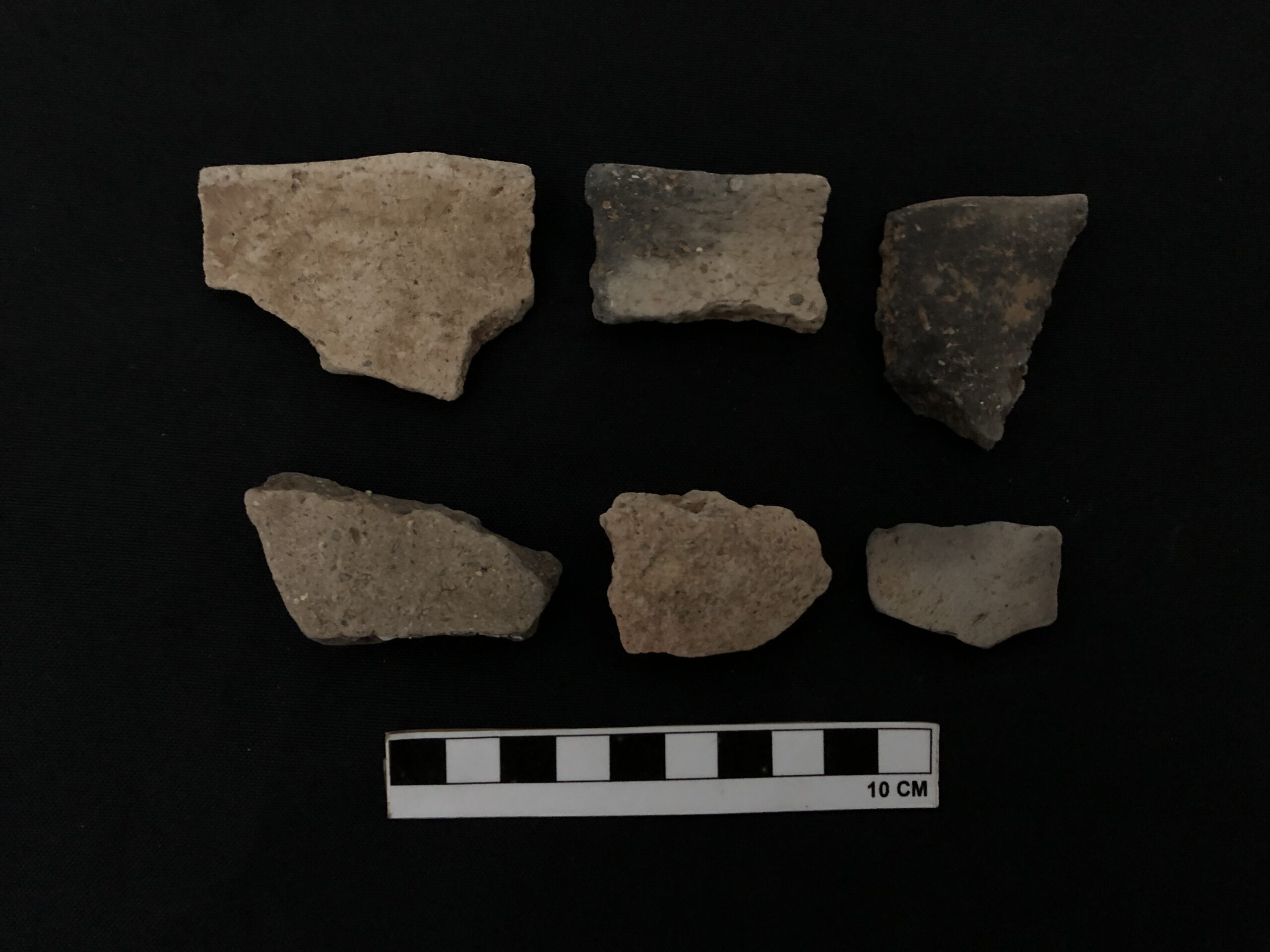 A cerâmica é o material confeccionado e moldado pela mão humana a base de variados tipos de terra, com diversas finalidades de uso, como no armazenamento de água, alimentos, restos mortais e entre outros. Disponível 06 fragmentos de peças de cerâmicas (3 bojos, peça da parte central e principal do corpo da cerâmica, e 3 bordas, parte superior da cerâmica .