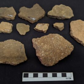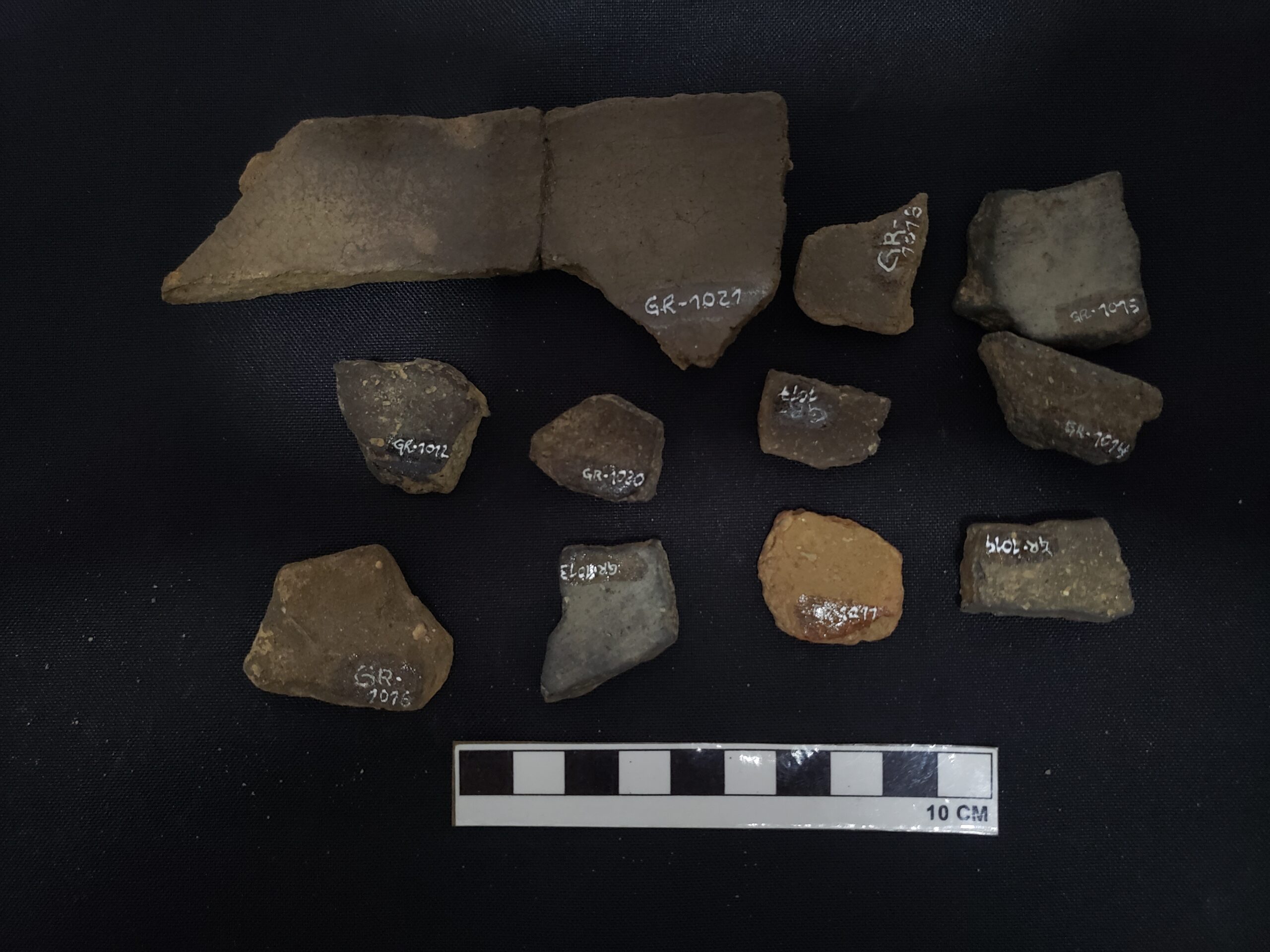Material cerâmico, devido a intensa fragmentação, tornou-se difícil identificar de qual parte da cerâmica faz parte, mas aparenta ser Bojos e Bordas. É a área entre a Base e a Borda.