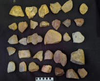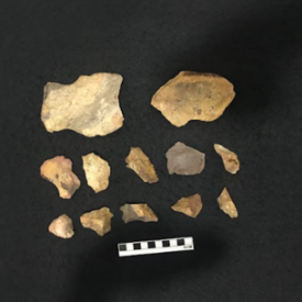 Materiais líticos identificados, como: Lascas - artefatos de talhe intencional que são extraídos de núcleos líticos; Núcleos - massa rochosa de onde se extraia lascas líticas. Utilizada na pré-história, a pedra lascada se destaca como o principal artefato dos caçadores-coletores tendo seu uso voltado a confecção de flechas e outros objetos cortantes.