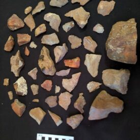 Líticos Arqueológicos - Lascas. Artefatos líticos são itens feitos de pedra que foram modificados pelas mãos humanas para desempenhar funções específicas, como a confecção de ferramentas e utensílios. São constituídas por siltito e arenito silicificados.