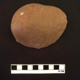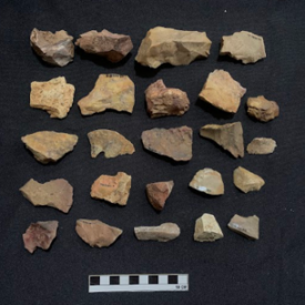Materiais líticos identificados, como: Lascas- artefatos de talhe intencional que são extraídos de núcleos líticos; Núcleos - massa rochosa de onde se extraia lascas líticas. Utilizada na pré-história, a pedra lascada se destaca como o principal artefato dos caçadores-coletores tendo seu uso voltado a confecção de flechas e outros objetos cortantes.