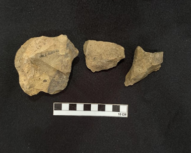 Materiais líticos identificados, como: Lascas- artefatos de talhe intencional que são extraídos de núcleos líticos; Núcleos líticos - massa rochosa de onde se extraia lascas líticas. Utilizada na pré-história, a pedra lascada se destaca como o principal artefato dos caçadores-coletores tendo seu uso voltado a confecção de flechas e outros objetos cortantes.
